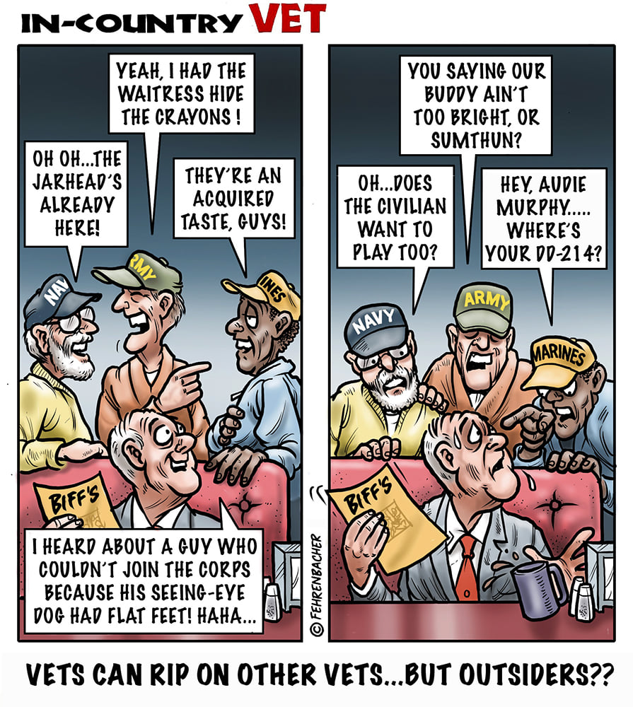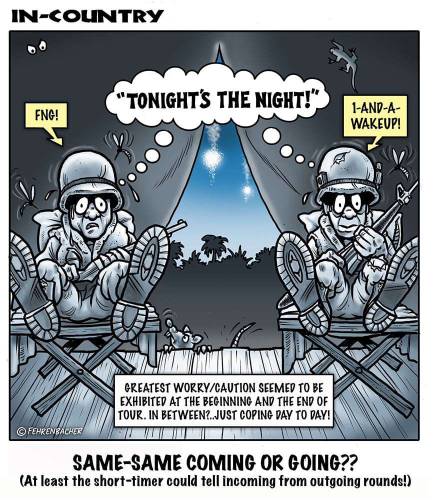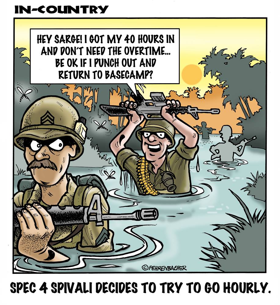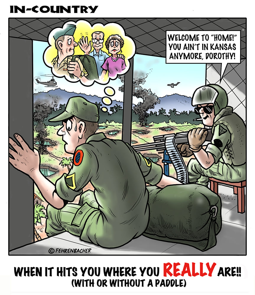 Phil enlisted in the Army in 1965 where you served for years in Vietnam. He became a graphic designer and has worked for the state of Oregon for 26 years. He retired in 2003 and started the Cartoon "In-Country". The cartoons reflect his experiences during his tour of duty in South Vietnam.