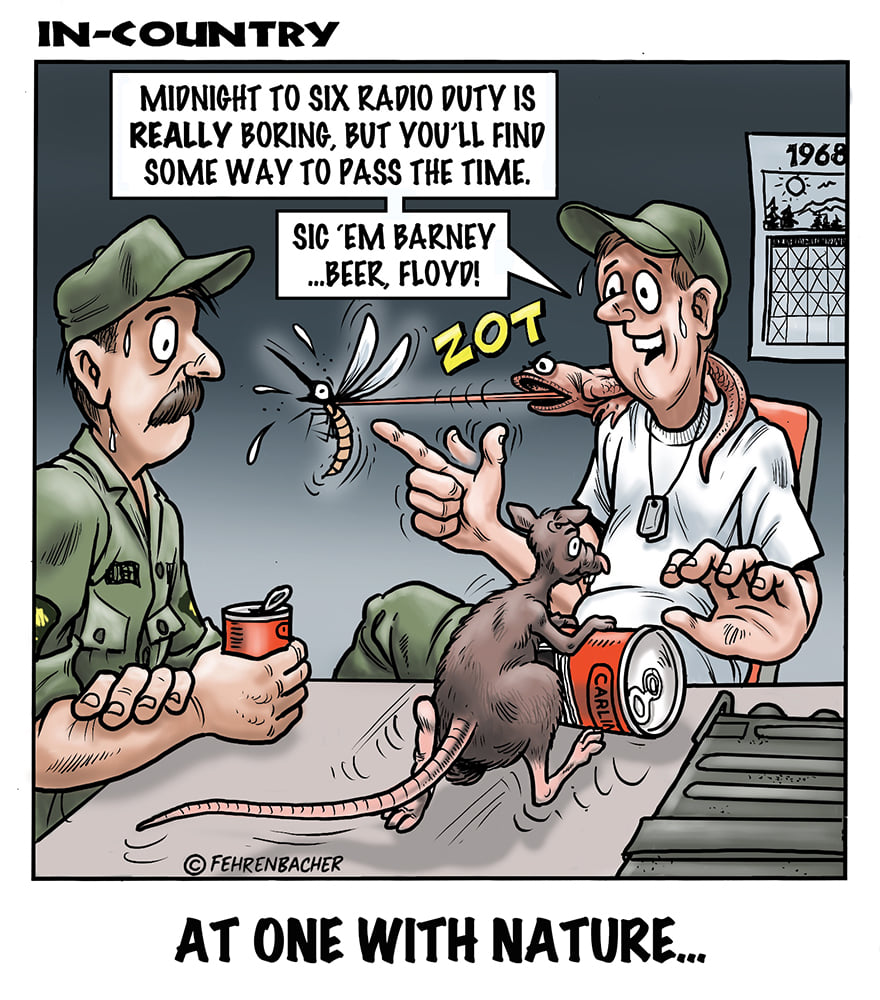 Phil enlisted in the Army in 1965 where you served for years in Vietnam. He became a graphic designer and has worked for the state of Oregon for 26 years. He retired in 2003 and started the Cartoon "In-Country". The cartoons reflect his experiences during his tour of duty in South Vietnam.